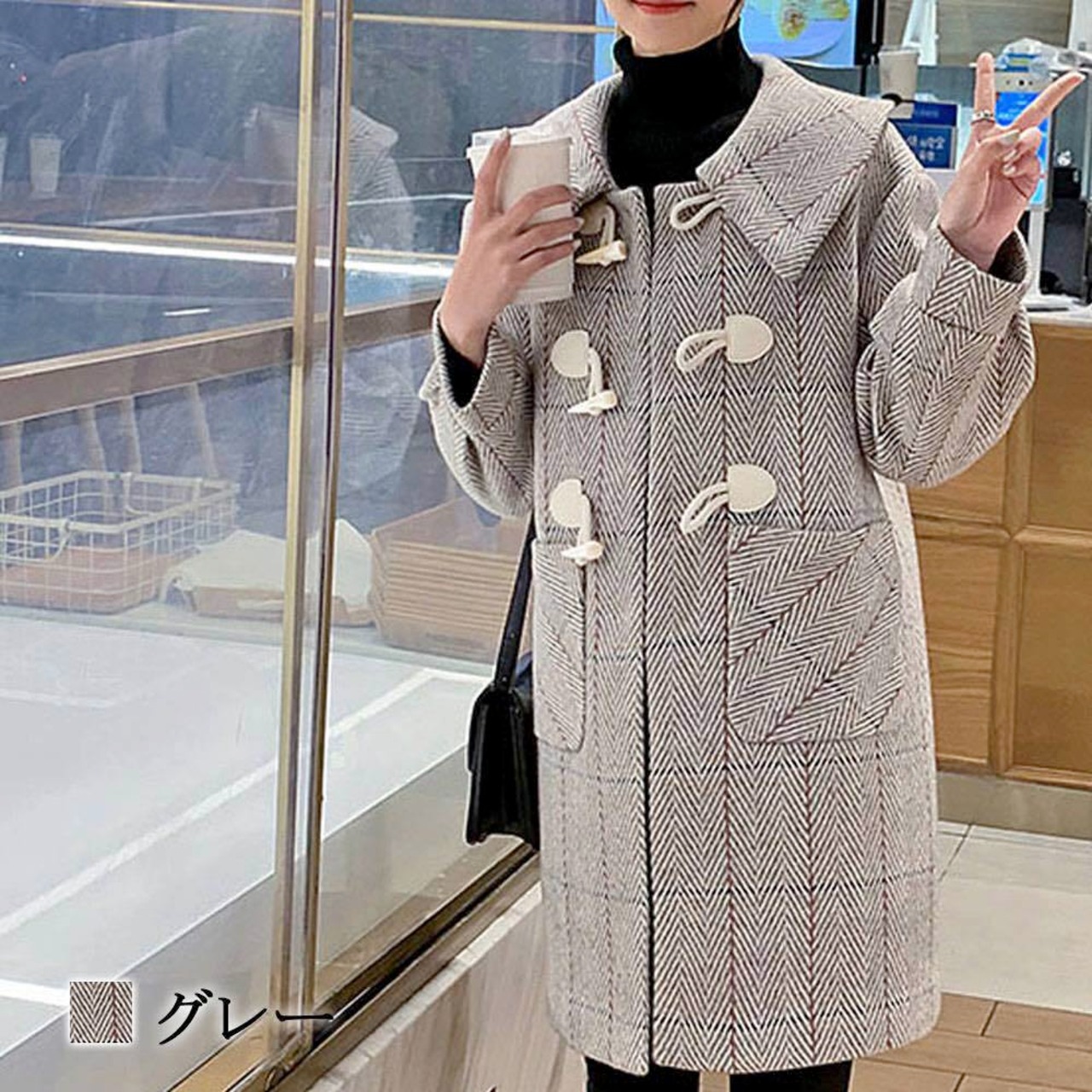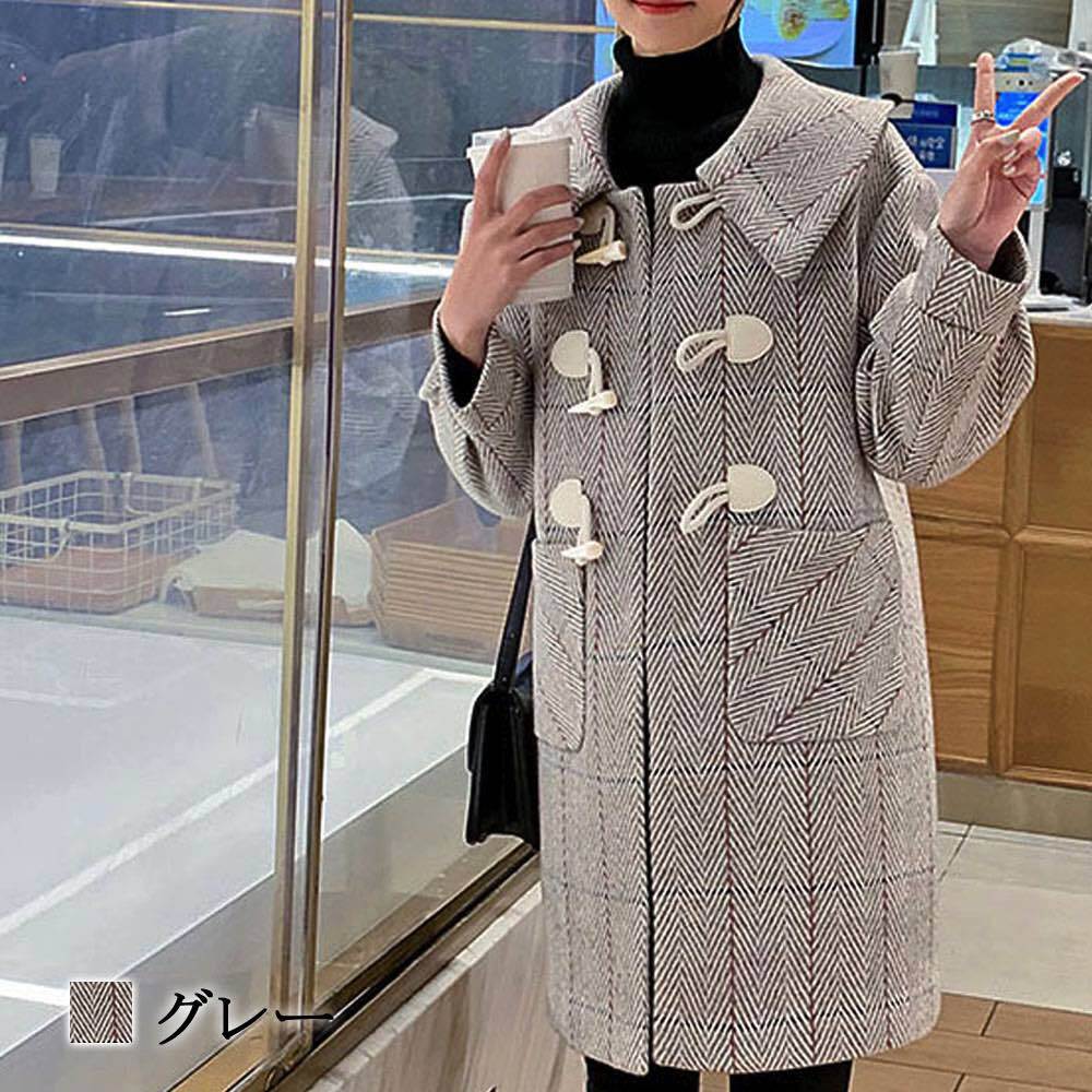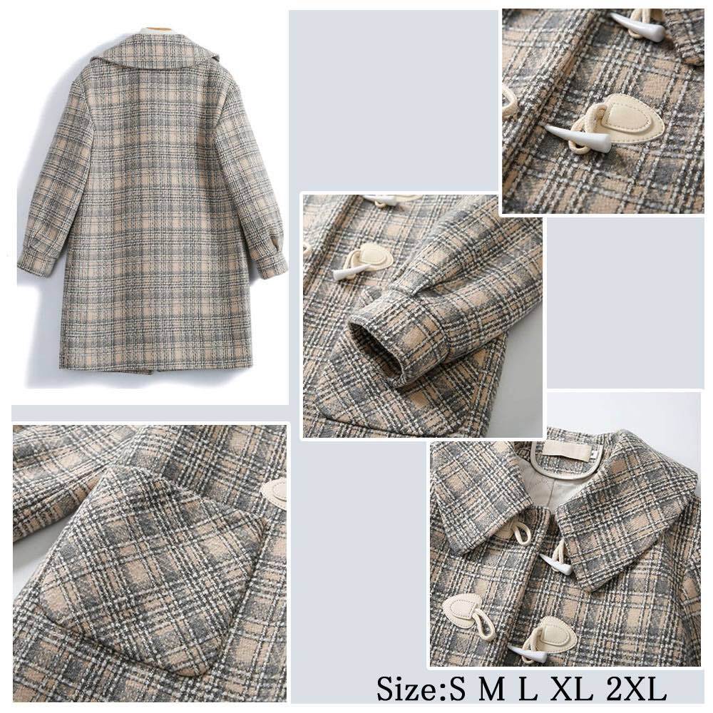大柄のチェックが目を引くホーンバックルのミドルコート。