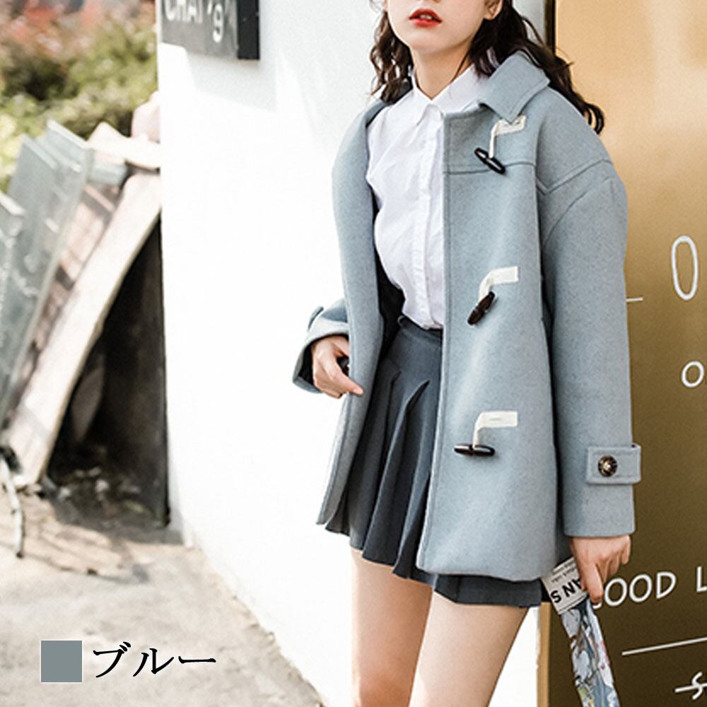 ペールトーンのカラーが軽やかな雰囲気のホーンバックルコート。