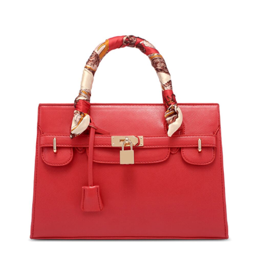 鮮やかなカラーとスカーフ使いが目を引くスクエアハンドバッグ。