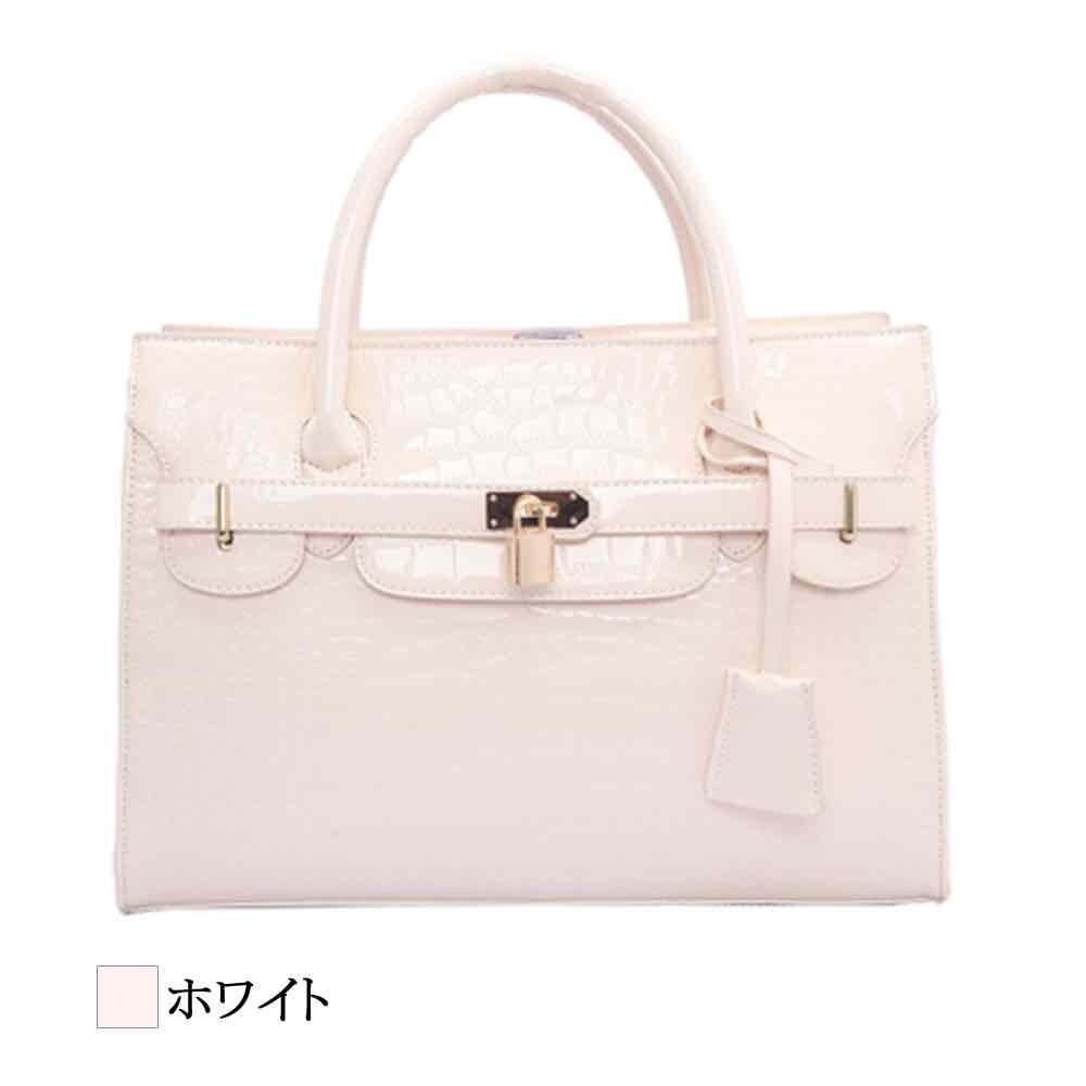 光沢感のあるエナメル素材にゴールドの金具が光る華やかなハンドバッグです。