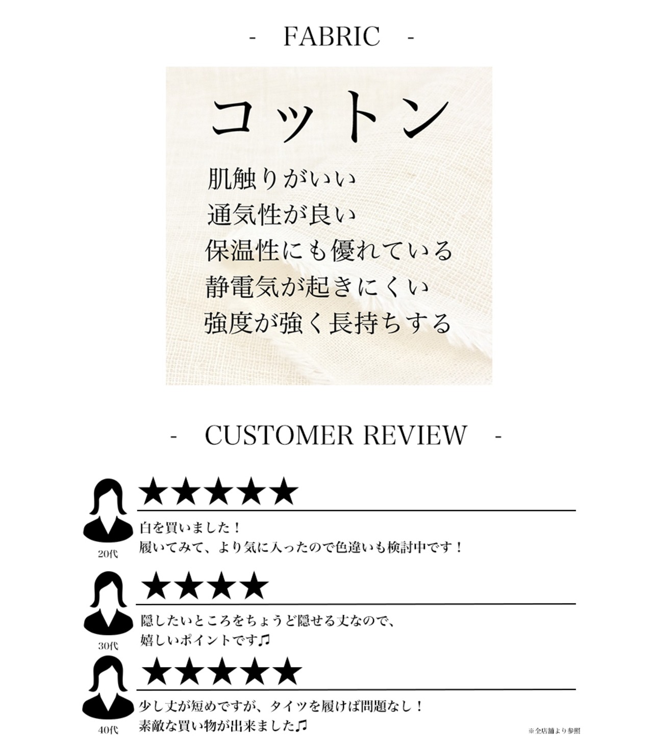 裾広がりな台形シルエットで、太ももを細く魅せてくれます。