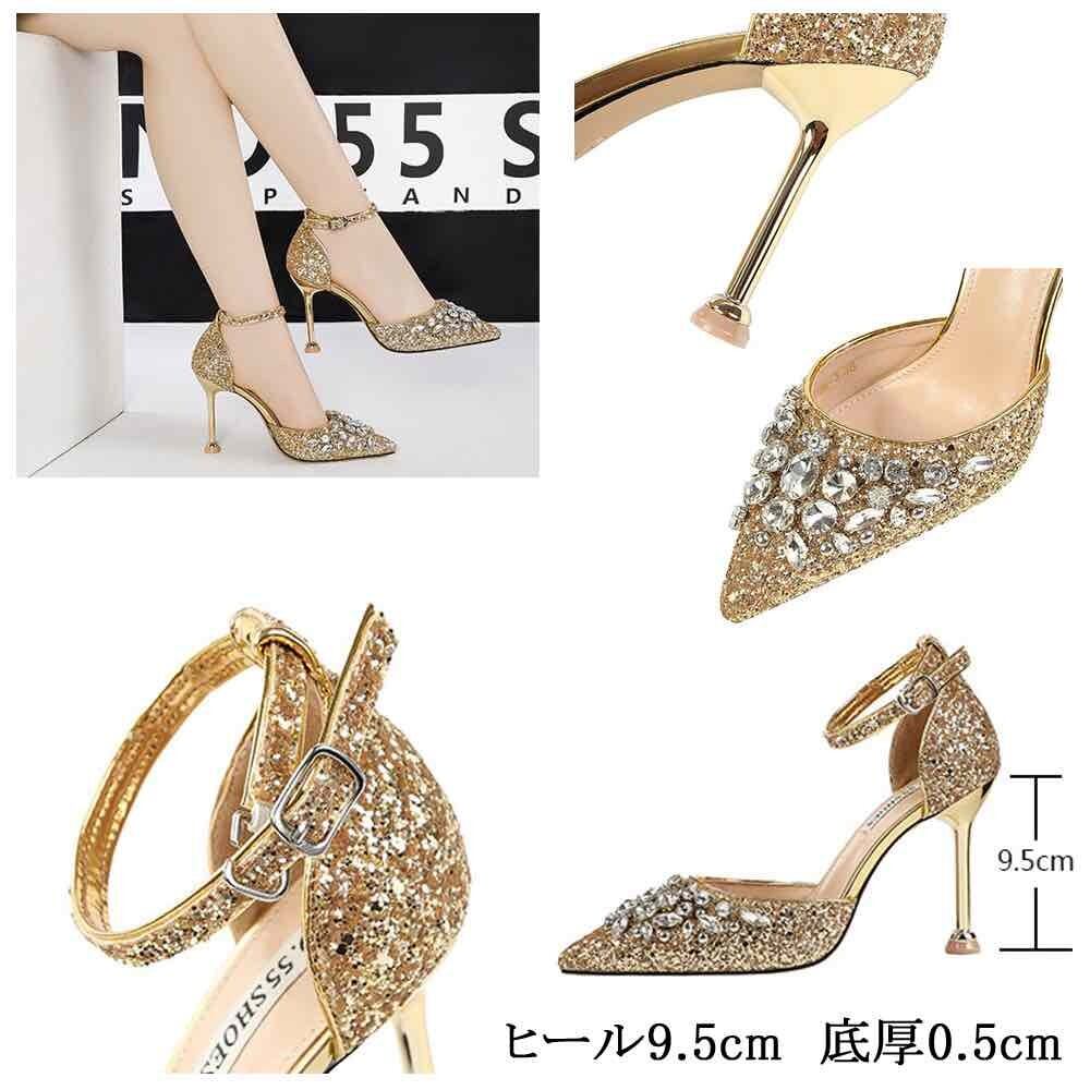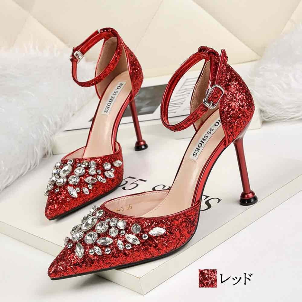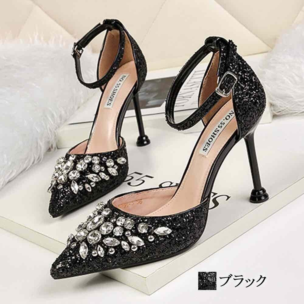 スパンコールのボディとフロントのビジュー使いが足元を華やかに見せてくれるスティレットヒール。