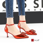 メタリックカラーとフロントチャームがインパクトのあるスティレットヒール。