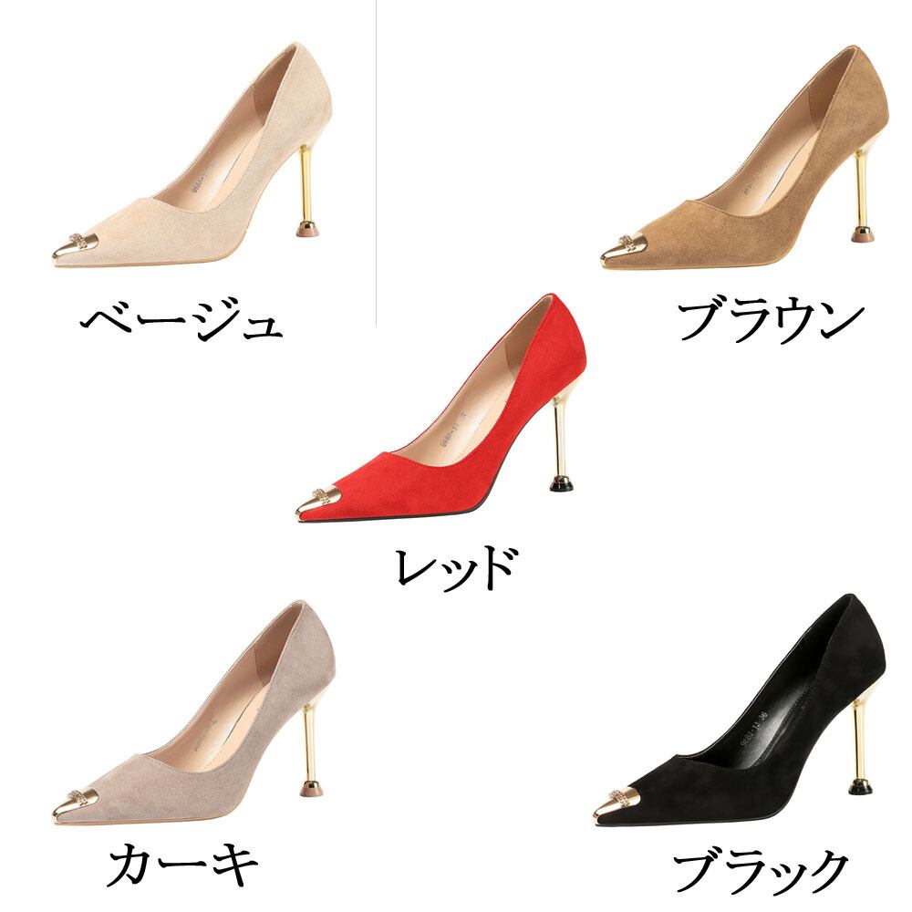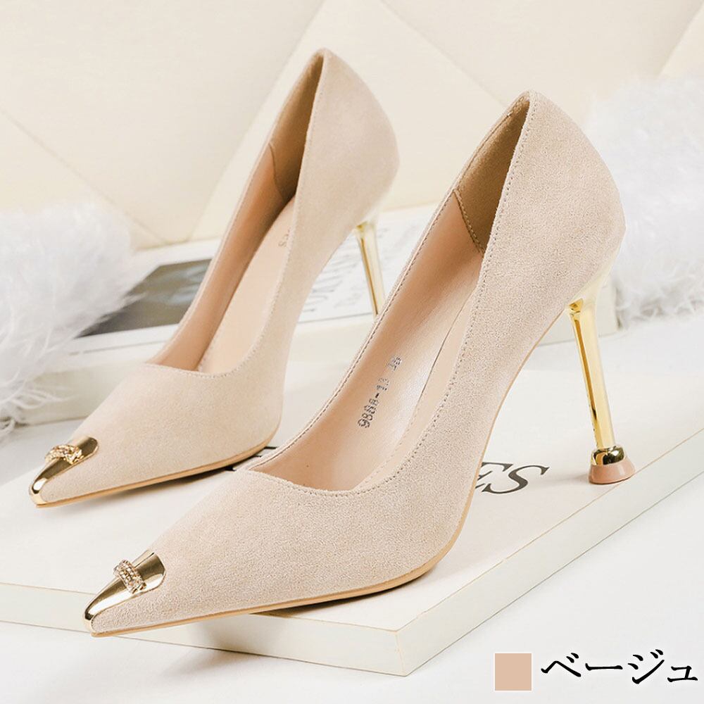 つま先のゴールドデザインがアクセントになったスエードのハイヒール。