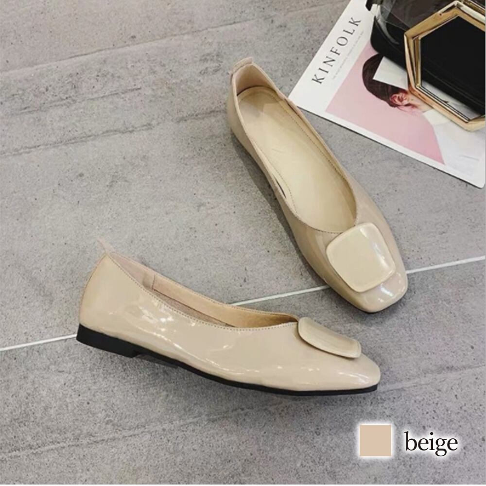フラットで歩きやすく、品の良いエナメル調はオンオフ問わず活躍。