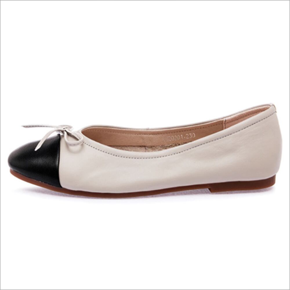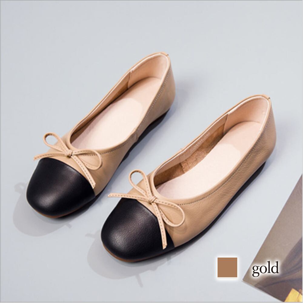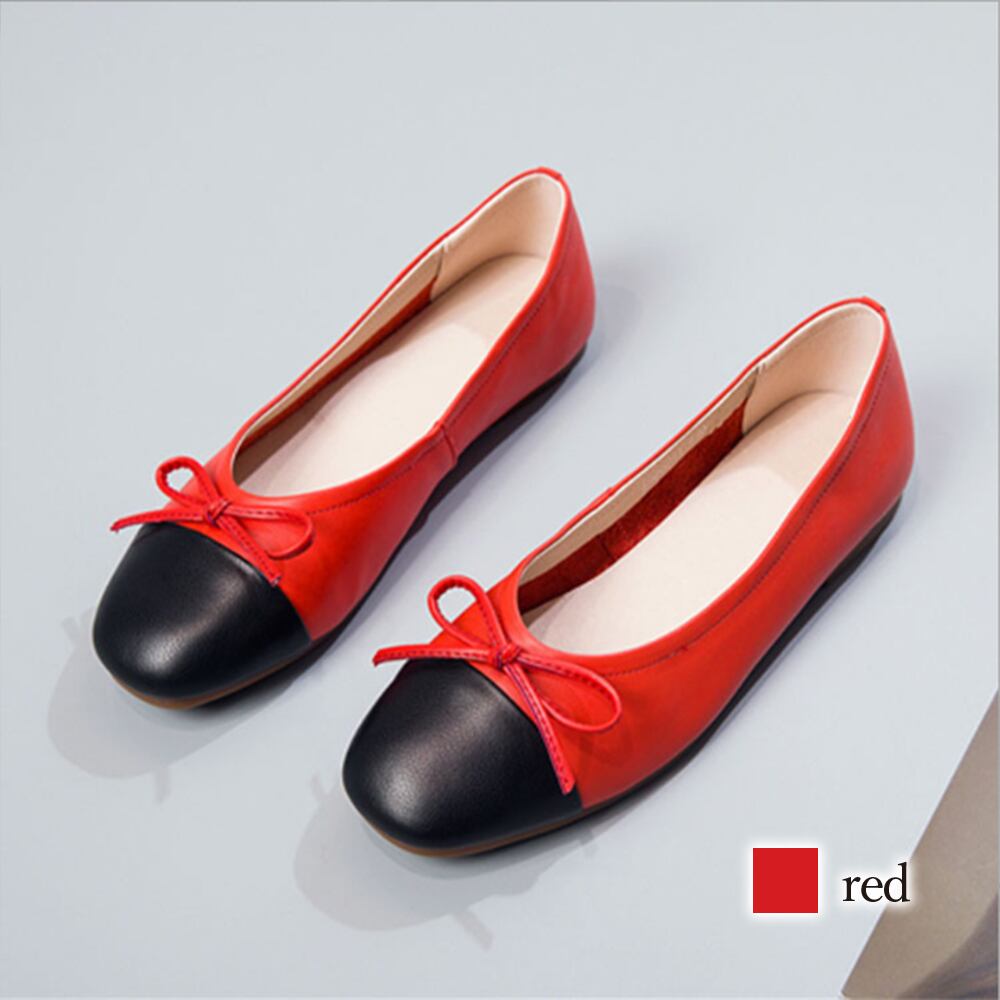 バイカラーとリボンのアクセントが可愛らしいレザーフラットシューズ。