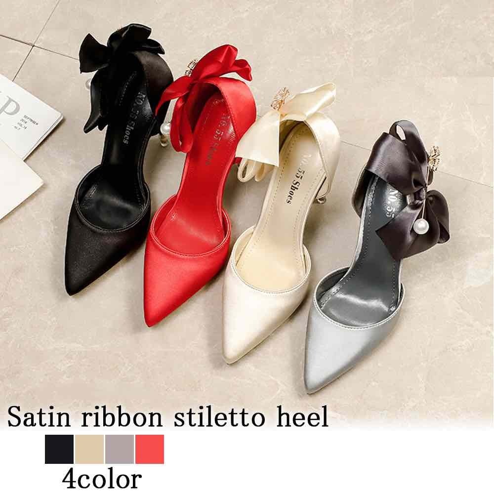 大胆なサテンリボンがエレガントな印象のスティレットヒール。