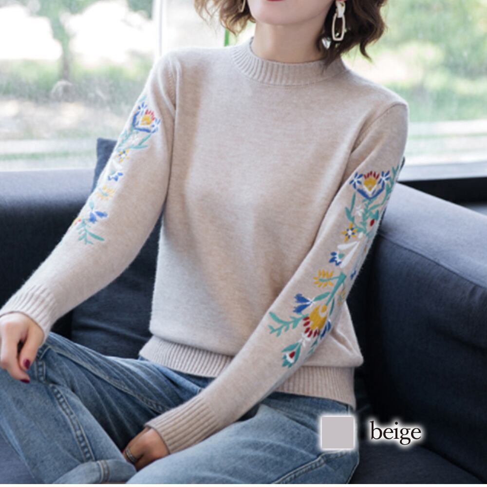 袖に刺繍された大胆な花柄が目を引くプルオーバーニット。