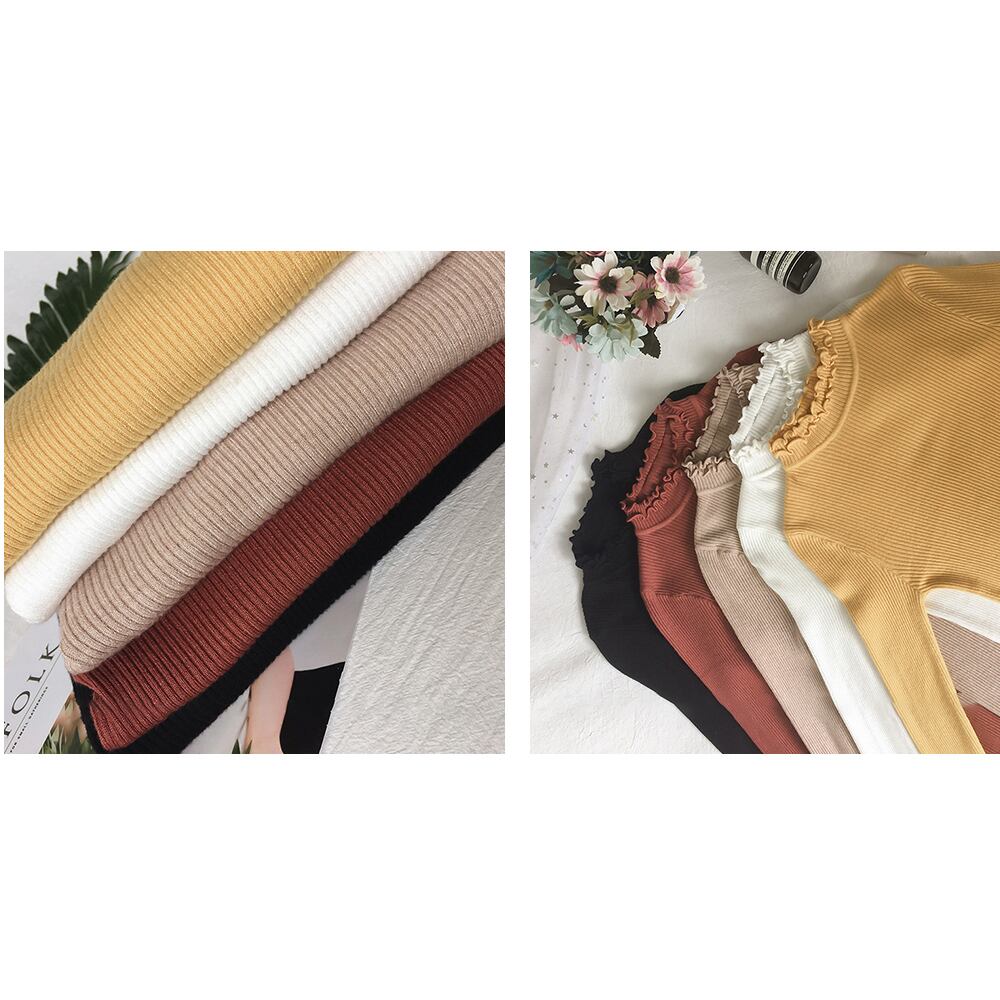 ネックと袖口のフリル使いが可愛らしいハイネックニット。