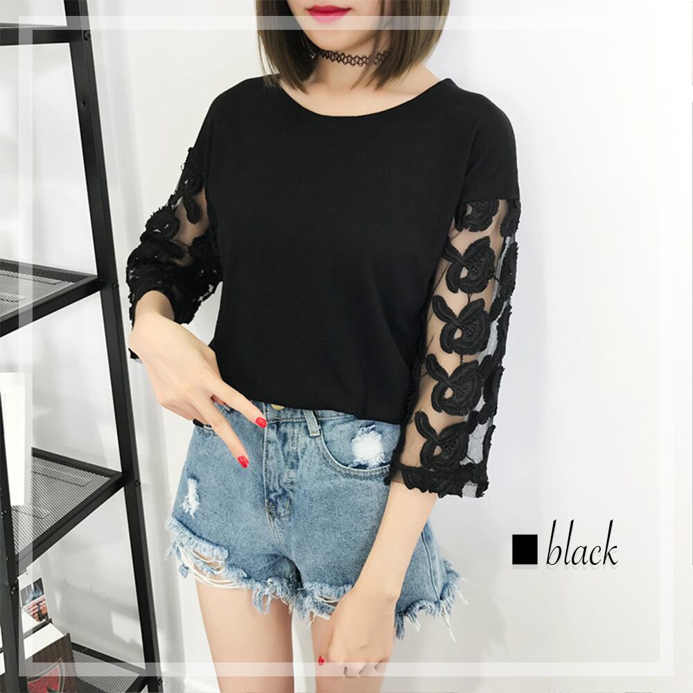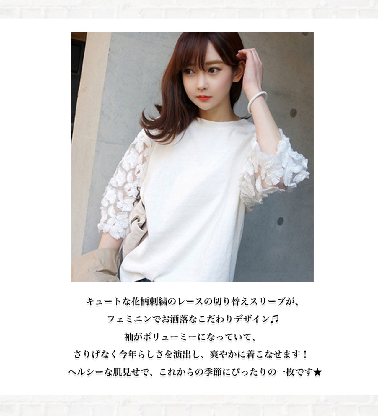 キュートな花柄刺繍のレースの切り替えスリーブが、