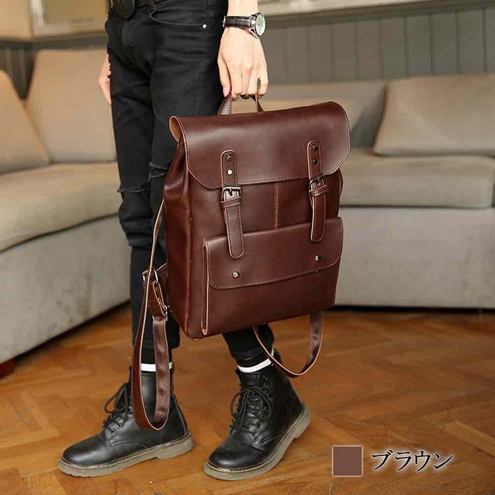 ベルト使いがクラシカルな印象のフェイクレザーバックパック。