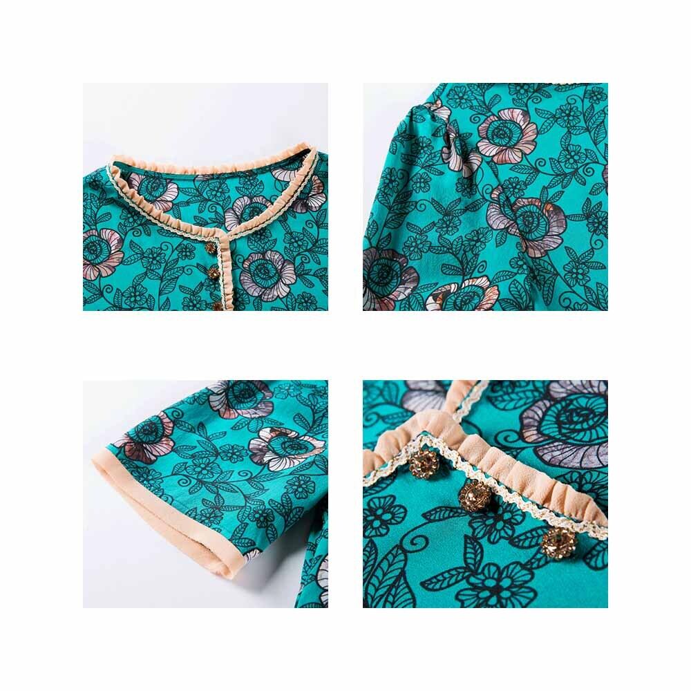 きらりと輝くボタンにレース風の花柄プリントで上品にまとめます。